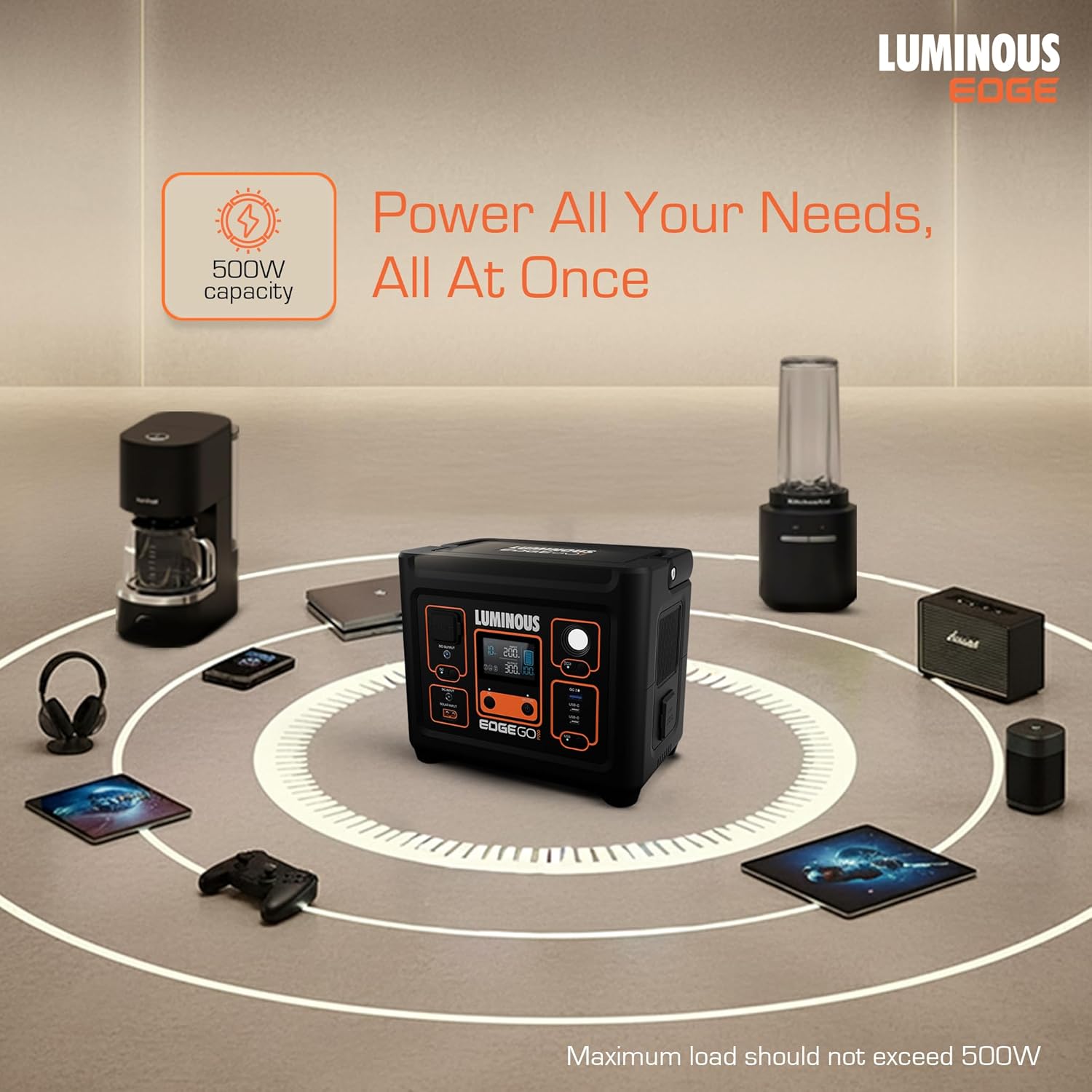 - 500W Portable Power Station for Home Backup & Outdoors – Luminous Edge GO P700 delivers 500W output and 288 Wh battery capacity to power appliances like laptops, cameras, drones, routers, smartphones, ring lights, speakers, projectors, mini-fridges, gaming consoles, portable fans, TVs, CPAP machines, and more.