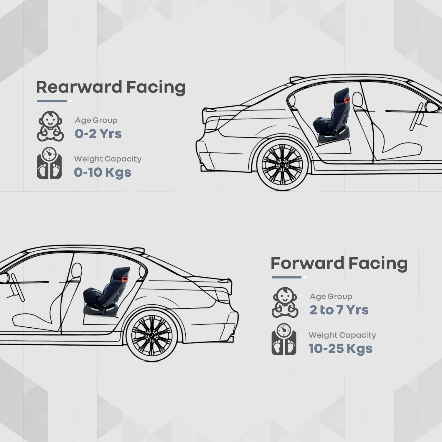 • Baby Car Seat- Group 2- Jack N Jill Grand can be used as Front Facing Car seat of 4-7 years Age group.It also supports weight from 18-25 Kgs of Child’s Weight